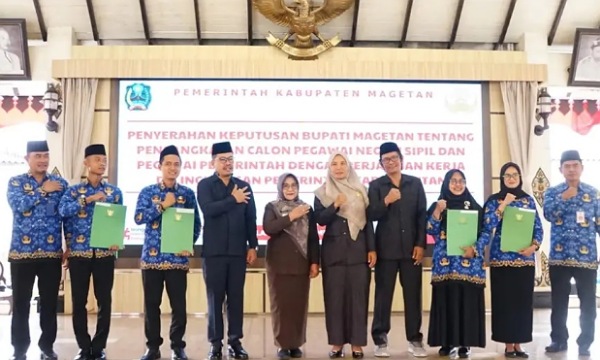 Magetan – Nusativi.com — Pemerintah Kabupaten Magetan resmi menyerahkan Surat Keputusan (SK) Bupati tentang pengangkatan Calon Pegawai Negeri Sipil (CPNS) dan Pegawai Pemerintah dengan Perjanjian Kerja (PPPK) formasi tahun 2024. Acara digelar di Pendapa Surya Graha pada Selasa (30/9/2025) pagi, dengan dihadiri langsung Bupati Magetan Hj. Nanik Endang Rusminiarti, M.Pd, pimpinan DPRD, kepala OPD, serta para undangan.